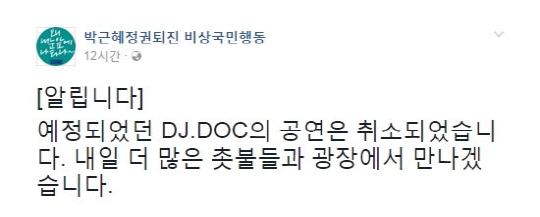 [스포츠조선닷컴 이지현 기자] DJ.DOC의 신곡 '수취인분명'을 11월 26일 촛불집회에서 들을 수 없게 됐다.