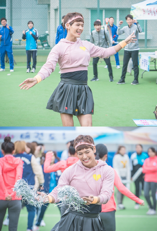 지일주의 '여장 열연'이 돋보이는 체육대회 치어리딩 현장은 지난 10일 서울시 송파구 한국체대에서 만들어졌다. 짧은 스커트를 입고 긴 속눈썹과 분홍빛 입술로 분장한 지일주는 부끄럼 없이 당당한 모습으로 현장에 등장, 스태프들의 찬사를 받으며 분위기를 달궜다. 현장에서 더욱 빛을 발하는 지일주 특유의 밝은 에너지와 다채로운 표정이 '수영부 치어리더'로서 손색이 없었다는 후문.