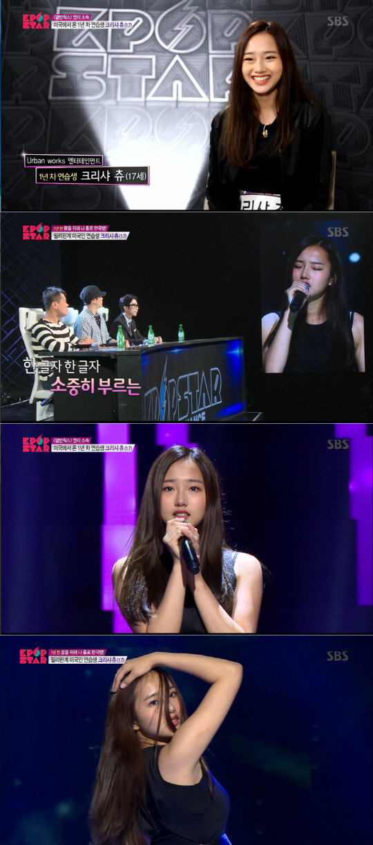 [스포츠조선 이유나 기자] '케이팝스타6' 참가자 크리샤가 심사위원들을 주목시킨 빼어난 외모와 수준 높은 실력으로 만장일치 합격을 받았다.