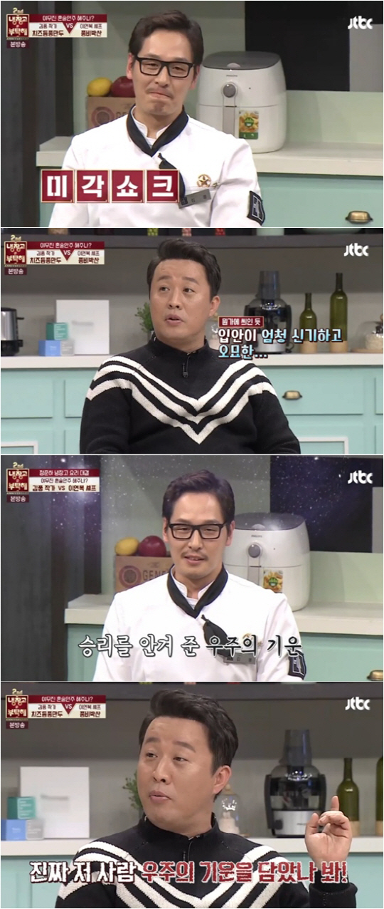 정준하는 "비주얼 상으로 이연복 요리는 고급 세단이고 김풍 요리는 폐차 직전의 차"라며 너스레를 떨었다. 하지만 맛에 있어서 김풍의 요리는 역시 반전이었다. 정준하는 "이분 굉장히 독특한 분이다. 단맛, 짠맛, 매운 맛이 한꺼번에 느껴진다. 입안이 신기하고 오묘하다 자꾸 손이가 술 안주로 좋겠다"며 감탄했다.