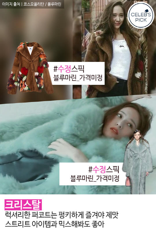 퍼 코트 역시 한층 영(young)하게 입어보자. 꽃이 핀듯 다양한 컬러 퍼가 뒤섞인 스타일이나 동화 같은 민트 색 등 프리티한 스타일을 추천한다. 크리스탈처럼 기본 아이템과 매치해 일상 패션으로 활용하거나, 실키한 소재의 드레스와 함께해 페미닌한 스타일을 즐겨보는 것도 좋다. 크리스탈의 퍼 코트는 블루마린 제품이다.