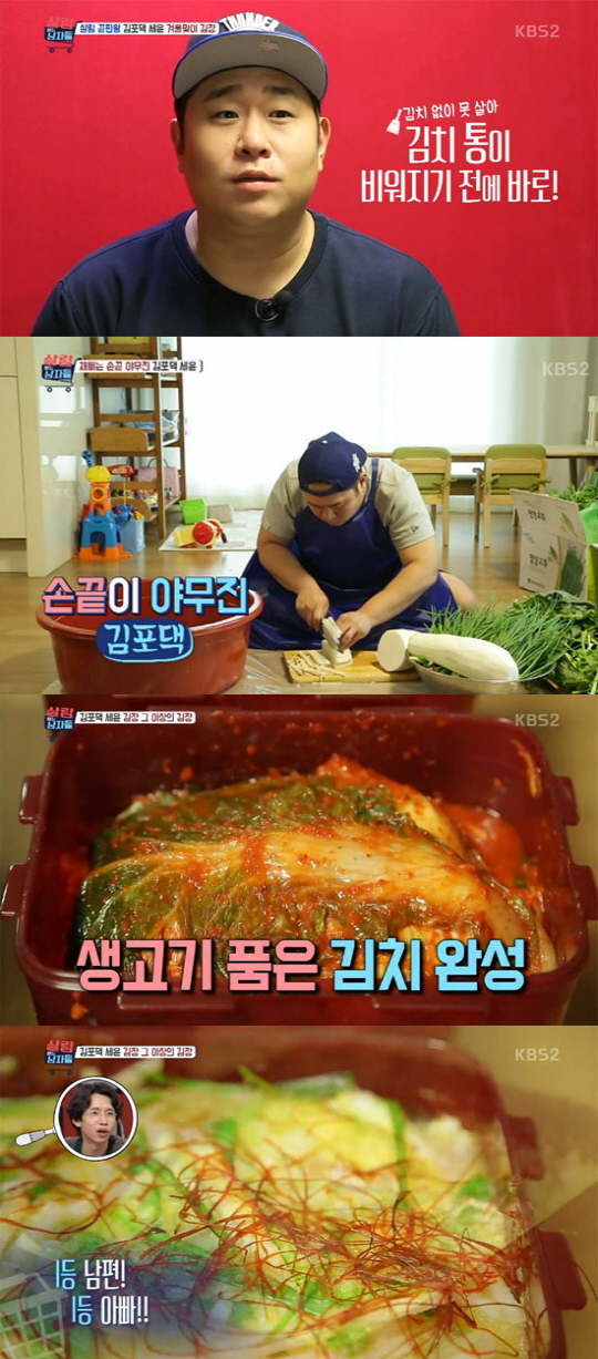 특히 문세윤은 생고기를 김치 속에 함께 넣는 '김치찌개용 김치'를 만들었다. "저런 방법이 있냐"라며 김승우는 감탄했고, 홍일점 윤손하도 "말은 들어봤는데 진짜 하시냐"라며 덧붙였다.
