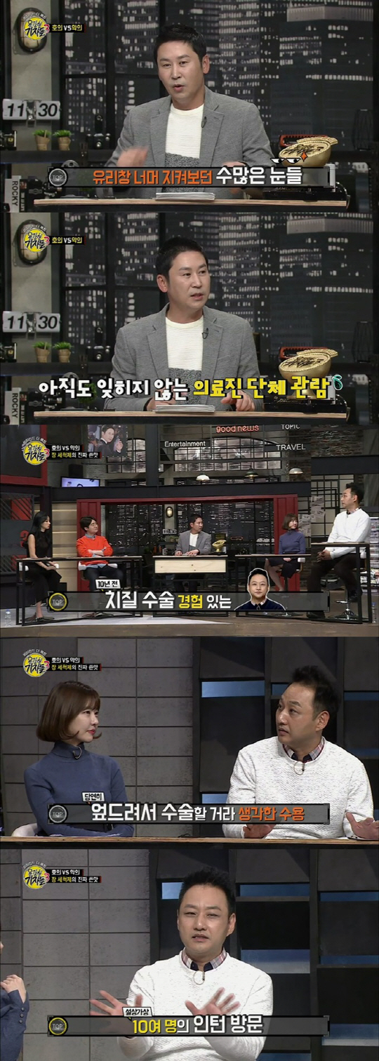 MC 신동엽은 대장내시경 경험을 공개하며 "검사 도중 유리창 건너편으로 여자 의사와 간호사 스무 명 정도가 내 모습을 지켜보고 있었다"고 밝혀 웃음을 자아냈다. 그는 토크 도중 패널들에게 "얼굴이 알려져 있어 병원 가기 꺼려질 때가 있냐"고 질문했다. 김수용은 이에 "10년 전 치질수술을 받았다"며 당시 민망했던 상황을 고백했다.