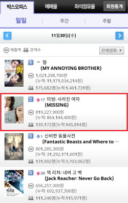 영화 '미씽: 사라진 여자'가 동시기 개봉작 중 박스오피스1위를 차지하며 흥행 청신호를 밝혔다.