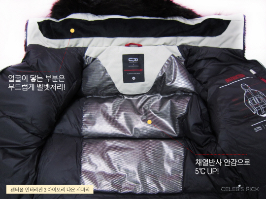 아무리 예쁜 제품도 제 역할을 못하면 무슨 소용이 있으랴. 이 구스다운은 무엇보다도 아웃도어 브랜드의 제품답게 기능성이 좋았다. 얼굴에 닿는 카라 부분은 부드럽게 벨벳처리 되어 따뜻함이 느껴졌고 메이크업으로 오염될 염려도 덜었다. 등쪽에는 '채열반사 어쩌고~ 안감'이 부착되어있는데 사실 어려운 말보다는 실제로 입어보면 5℃씨가 올라간다는 말이 이해될 것. 실제로 입었다가 벗어보면 등 부분의 안감에만 체온의 뜨끈함이 오래 남는다.