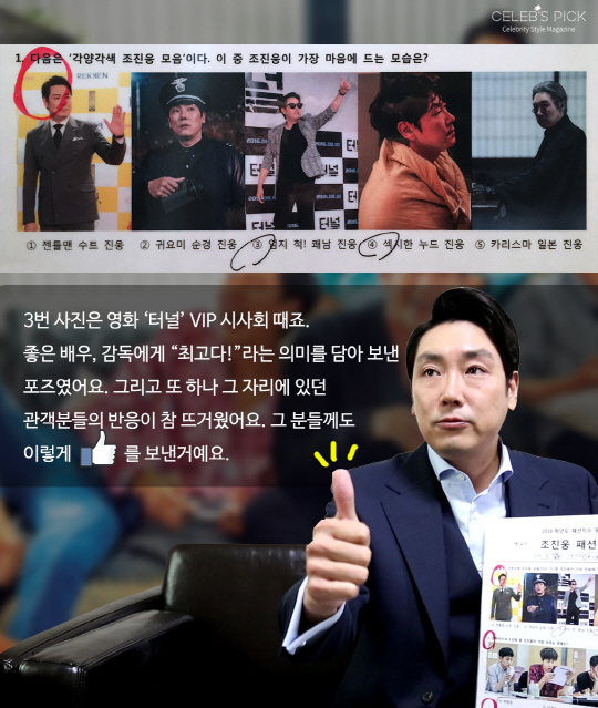 십여 년 동안 쉬지 않고 영화 '사냥', '아가씨', '암살', '군도' 등 수많은 작품에서 다양한 캐릭터로 변신해 찬사를 받은 조진웅인만큼, 배우들과 감독들이 한 작품을 위해 얼마나 많은 고민과 노력을 하는지 누구보다 잘 알고 있을텐데요. 동료들에게 그리고 그 노력을 알아주는 관객들에게 보내는 엄지에서 열정과 에너지를 느낄 수 있었습니다. 2017년 개봉 예정작인 영화 '보완관' 역시 기대케 만드는 모습이지요.
