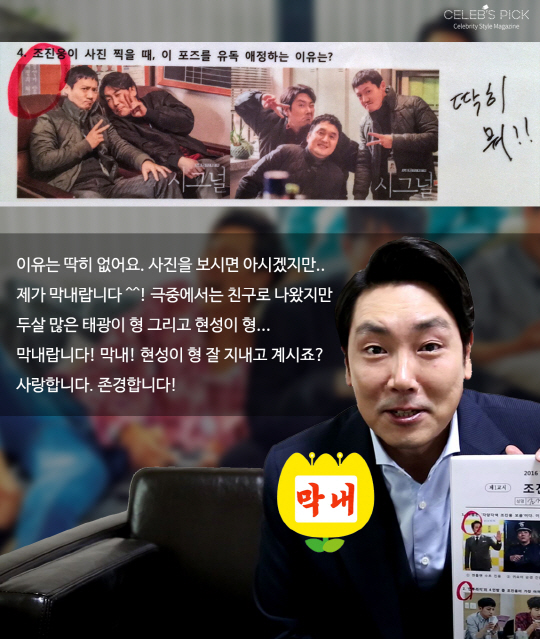 막내를 강조하면서 함께 '시그널' 김범주 수사국장 역을 맡은 장현성에게 깨알 안부까지 전하는 조진웅입니다.