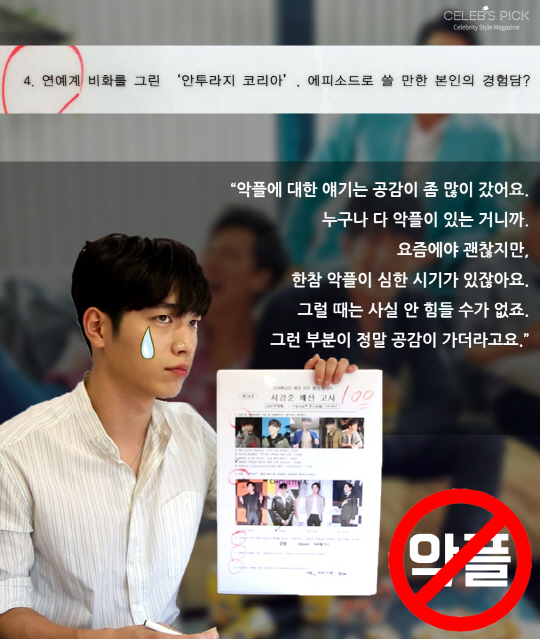 "극중에서 영빈이(서강준)가 영화를 찍었는데, 그 영화가 시사회를 하고 난 뒤 기자들과 대중들이 많은 악플이 달린 거예요. 그래서 영빈이가 그걸 보고 굉장히 힘들어하는 장면이 있었어요.('안투라지' 1회 내용 중) 그런 것들을 보니 공감이 많이 되더라고요. 누구나 다 그렇듯 저 또한 악플이 있으니까요. 한참 악플이 심할 시기들이 있잖아요. 작품을 잘 못 표현해냈다든가, 논란에 좀 휘말렸다든가... 그럴 때가 있는데 그럴 때는 사실 안 힘들 수가 없죠. 그런 부분들이 공감이 정말 많이 됐어요."