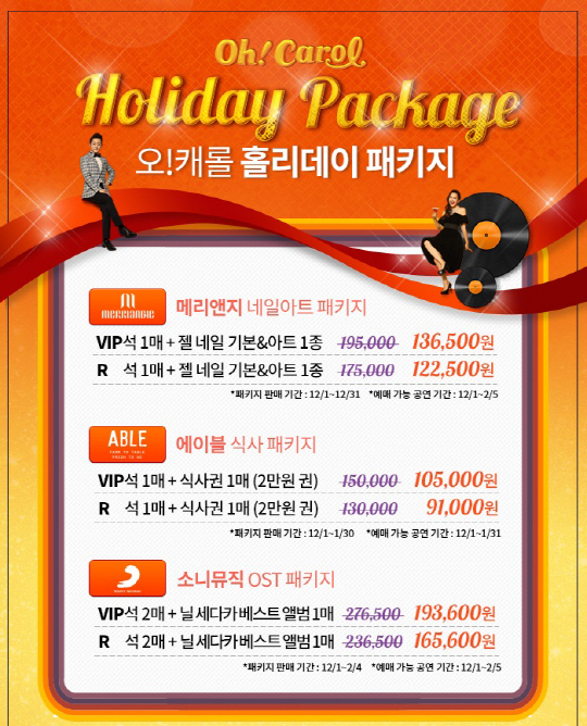 팝의 거장 닐 세다카의 히트팝으로 만든 뮤지컬 '오! 캐롤'(광림아트센터 BBCH홀, 내년 2월 5일까지)이 연말을 맞아 '로맨틱 홀리데이 패키지' 3종을 출시했다. 공연 관람과 네일아트, 앨범 등을 특별 할인가로 묶었다.