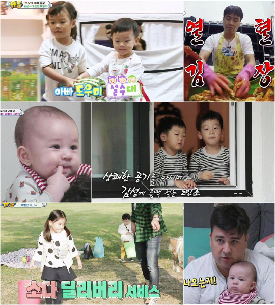 24개월 된 대박은 호기심 천국이었다. 김장하는 내내 배추, 무 등을 가리키며 "이게 뭐냐"고 아빠한테 끊임없이 질문했다. 설아와 수아는 늙은 호박과 홍시 10개를 사오라는 아빠의 심부름도 거뜬히 해낼 정도로 듬직했다. 인형인줄 알았던 방긋 웃기만 하던 윌리엄도 한뼘 더 자란 앙증맞은 모습으로 눈길을 끌었다. 소을의 유창한 영어 실력 또한 화제를 모았다. 아이들은 애교도 늘었다. 대박은 아빠가 김장이 힘들어 거실에 드러눕자 쪼르르 달려와 아빠의 입에 뽀뽀했다.