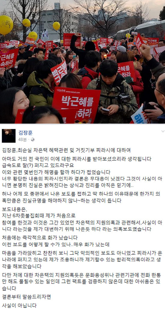 보도내용은, 지난 6차촛불집회때 제가 처음으로 참여를 한것과 이것은 그간 있었던 차은택의 지원의혹과 관련해서,사실이 아니다 라는것을 제가 대변하기 위해 나온듯 하다 라는 의혹보도였습니다