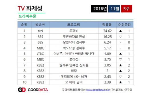 [스포츠조선닷컴 정안지 기자]2016년 11월 5주차 TV화제성 드라마 부분 순위에서 새 금토 드라마 '도깨비'가 1위를 차지했다.