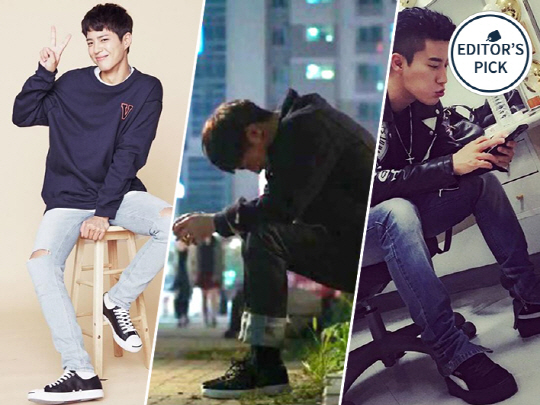 이처럼 청량한 청년이 또 있을까요. 박보검은 스슌셔츠와 데님에 깔끔한 스니커즈를 매치해 캐주얼한 무드의 패션을 완성했습니다. 어두운 상의, 밝은 하의의 중심을 마무리해주는 블랙&화이트의 심플한 스니커즈가 정말 매력적이네요. 데님, 슬랙스 다양한 아이템에 연출해도 모두 잘 어울려요. 컨버스 제품.