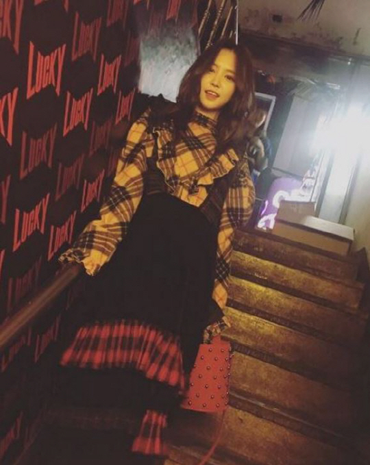 손나은은 V라인의 프릴 장식과 체크패턴이 돋보이는 옐로우 체크 프릴 블라우스를 매치했습니다. 드롭숄더 퍼프 소매로 유니크하고 볼륨감있는 소매 라인을 연출하네요. 뒤가 트여있는 백오픈 스타일로 레이어드로도 연출 가능한 디자인입니다. 톡톡한 면 소재를 사용하여 따뜻하고 부드러운 분위기를 느낄 수 있습니다. 럭키슈에뜨 제품.