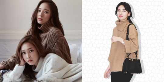 크리스탈이 선택한 두꺼운 케이블 터틀넥 니트는 도톰한 두께감과 보는 것 만으로도 온기가 전해져 더욱 따스한 스타일링을 할 수 있다. 얇은 캐시미어 소재의 터틀넥은 케이블이 부드럽게 몸을 감싸며 은은한 온기를 전할 수 있는 아이템이다. 수지는 절개 디테일이 가미된 터틀넥을 매치하고, 소매 부분을 롤업해 더욱 스타일리시한 니트 스타일링을 완성했다.