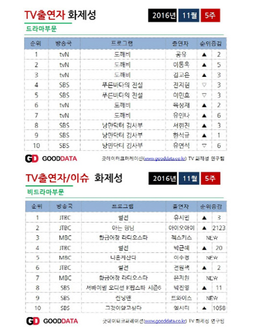 'TV 출연자 화제성' 부문에서 '도깨비'는 전원 상위권 진입(초반 마케팅 효과의 반영결과)에 성공했다. 차주부터는 도깨비-푸전-낭만닥터 출연진의 본격적인 순위 경쟁이 시작될 것으로 예상된다.