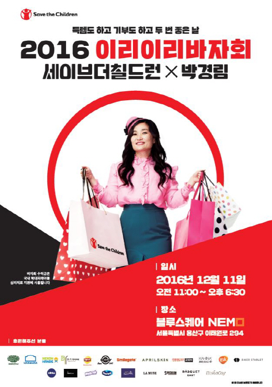 박경림은 "올 한해 유난히 슬프고 아픈 소식들이 많았지만 역시 결론은 '우리아이들은 우리가 지켜야한다'는 것이다"며 "연말연시를 맞아 웃으면서 즐겁게 나눌 수 있는 기부가 되도록 이번 바자회를 마련했다"고 밝혔다.