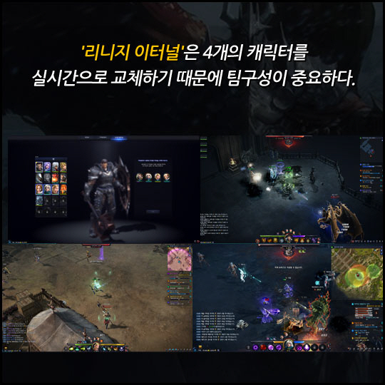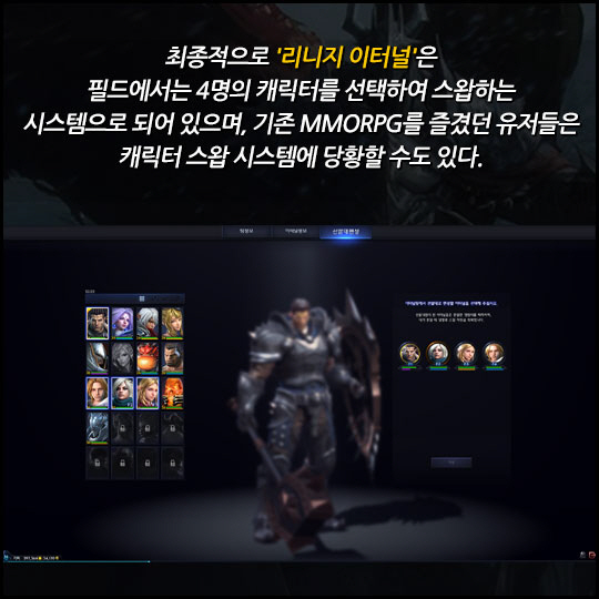 '리니지 이터널'은 필드에서는 4명의 캐릭터를 선택하여 스왑하는 시스템으로 되어 있으며, 기존 MMORPG를 즐겼던 유저들은 캐릭터 스왑 시스템에 당황할 수도 있다.