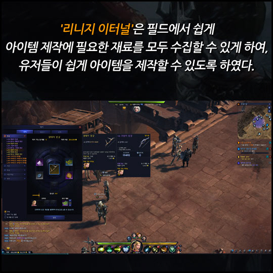 '리니지 이터널'은 '경매장', '아이템 파밍', 'PVP', '혈맹' 등 MMORPG에 필요한 핵심 요소들에 쉽게 접근할 수 있도록 하여, 아재들도 쉽게 게임 시스템에 적응할 수 있도록 하였다.