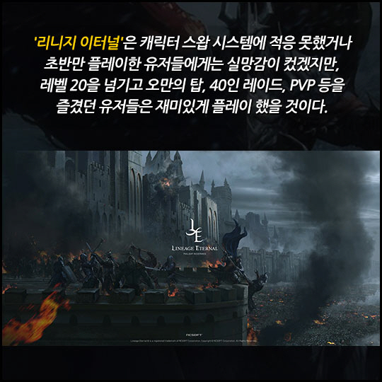 '리니지 이터널'은 캐릭터 스왑 시스템에 적응 못했거나 초반만 플레이한 유저들에게는 실망감이 컸겠지만, 레벨 20을 넘기고 오만의 탑, 40인 레이드, PVP 등을 즐겼던 유저들은 재미있게 플레이 했을 것이다.