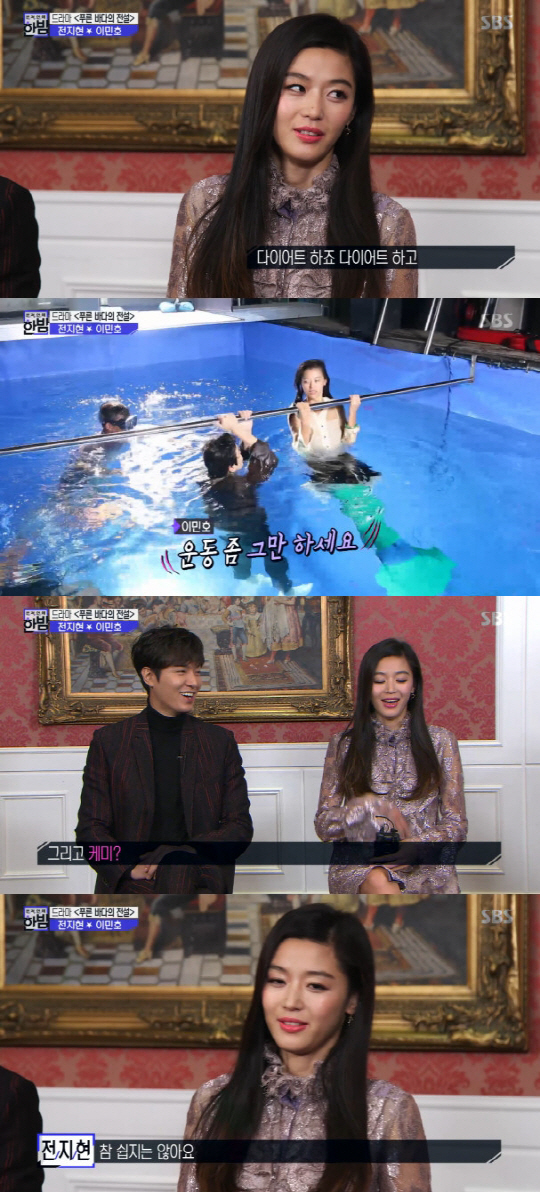 특히 눈길을 끈 것은 화제의 드라마 '푸른 바다의 전설' 독점 인터뷰. 출산 후에도 변함없는 미모를 뽐내며 '아름다운 인어'로 돌아온 전지현은 몸매 관리 질문에 "다이어트 한다. (몸매) 신경 많이 쓴다"며 "긴장을 놓치지 않는 게 가장 중요한 원동력이 되지 않나 싶다"고 답했다. 이를 들은 이민호는 "누나는 아침에도 운동한다. 촬영 쉬는 날이 있으면 난 그냥 아무것도 안 해야 쉬는 건데 누나는 쉬지 않고 운동한다"고 폭로했다. 이와 함께 드라마 촬영 중간중간에도 틈틈이 운동하는 전지현의 모습이 포착됐다. 결국 이민호는 전지현에게 "운동 좀 그만해"라고 말해 웃음을 안겼다.