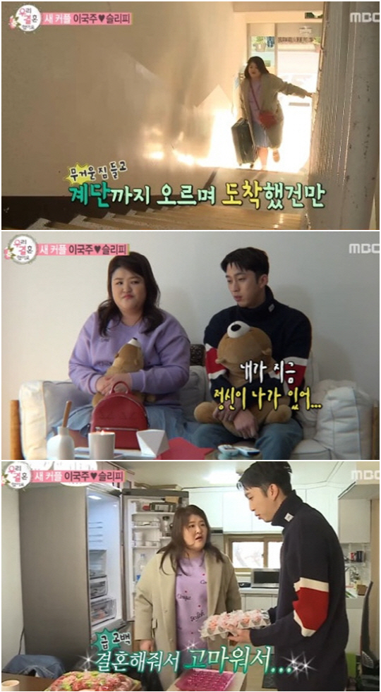 가상 결혼 첫날 낮잠을 자버린 슬리피 탓에 혼자 낑낑대며 짐을 들고 와야했던 이국주의 모습은 그간 '우결'에서는 쉽게 볼 수 없는 풍경이었다. 이미 기분이 상항 이국주에게 슬리피의 깜짝 '고기꽃' 이벤트도 통하지 않았다. 오히려 이국주는 "오빠가 자고 있으면 안 됐다. 주방에서 날 위한 요리를 하고 있었어야 한다"라고 성공팁을 알려줘 슬리피를 당황케 했다.