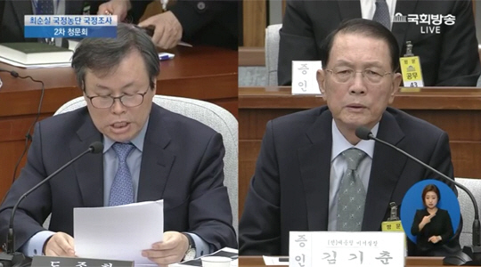 도종환 의원은 "증언 녹취에 보면 '위', '그분'의 지시라고 한다. 블랙리스트를 작성한 게 증인(김기춘)이 아니면 누구냐, 대통령이냐"고 되물었다. 하지만 김기춘 전 실장은 다시 고개를 저으며 "교육문화수석실의 일이다. 청와대에서는 블랙리스트를 만들지 않았다"라고 강조했다.