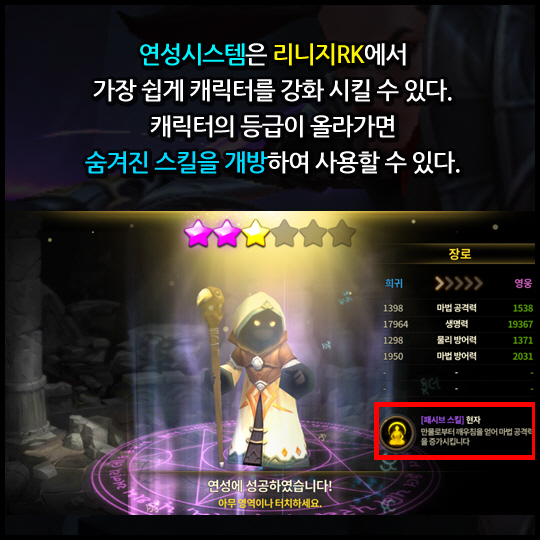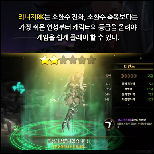 리니지RK는 1성 캐릭터도 연성(각성)을 할 수 있기 때문에 1성~2성 소환수를 연성시켜 캐릭터를 강화 시킬 수 있다.