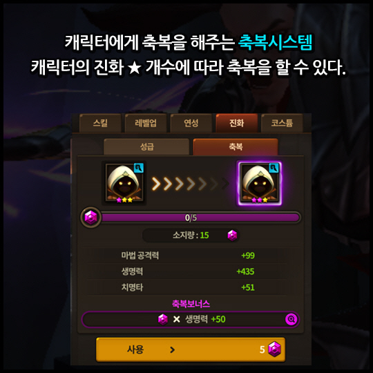 캐릭터의 진화 ★ 개수에 따라 축복을 할 수 있다.