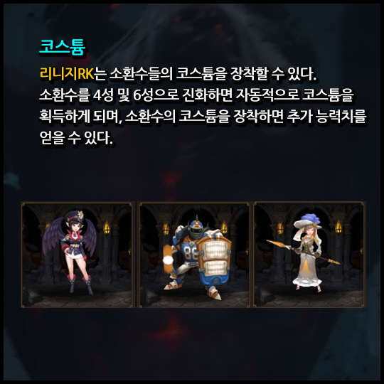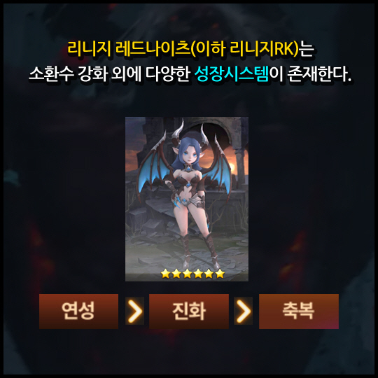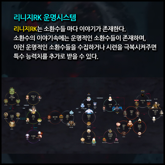 리니지RK 운명시스템 리니지RK는 소환수들 마다 이야기가 존재한다. 소환수의 이야기속에는 운명적인 소환수들이 존재하며, 이런 운명적인 소환수들을 수집하거나 시련을 극복시켜주면 특수 능력치를 추가로 받을 수 있다.