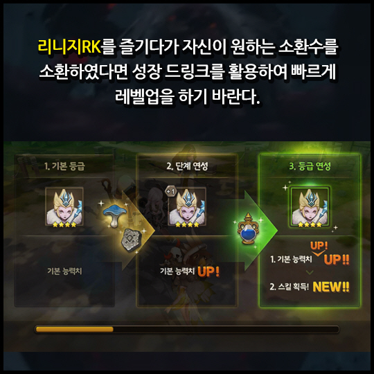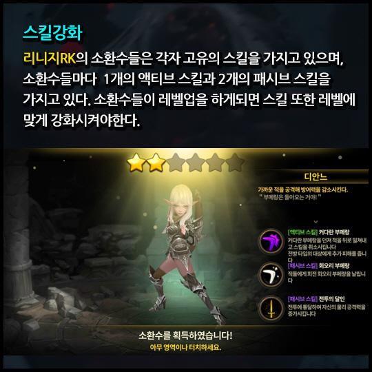 스킬강화 리니지RK의 소환수들은 각자 고유의 스킬을 가지고 있으며, 소환수들마다 1개의 액티브 스킬과 2개의 패시브 스킬을 가지고 있다. 소환수들이 레벨업을 하게되면 스킬 또한 레벨에 맞게 강화시켜야한다.