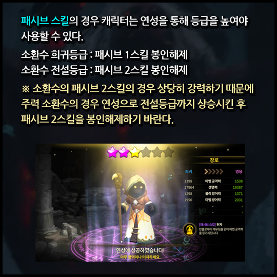 ※ 소환수의 패시브 2스킬의 경우 상당히 강력하기 때문에 주력 소환수의 경우 연성으로 전설등급까지 상승시킨 후 패시브 2스킬을 봉인해제하기 바란다.
