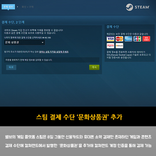밸브의 게임 플랫폼 스팀은 8일 그동안 신용카드와 휴대폰 소액 결제만 존재하던 게임과 콘텐츠 결제 수단에 컬쳐랜드에서 발행한 '문화상품권'을 추가해 컬쳐랜드 계정 인증을 통해 결제 가능