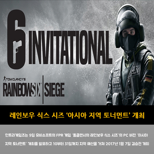 인트라게임즈는 9일 유비소프트의 FPR 게임 '톰클랜시의 레인보우 식스 시즈'의 PC 버전 '아시아 지역 토너먼트' 개최를 발표하고 10부터 31일까지 지역 예선을 거쳐 2017년 1월 7일 결승전 개최