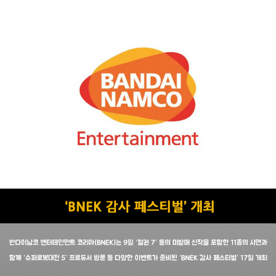 반다이남코 엔터테인먼트 코리아(BNEK)는 9일 '철권 7' 등의 미발매 신작을 포함한 11종의 시연과 함께 '슈퍼로봇대전 5' 프로듀서 방문 등 다양한 이벤트가 준비된 'BNEK 감사 페스티벌' 17일 개최