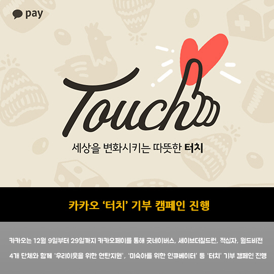카카오는 12월 9일부터 29일까지 카카오페이를 통해 굿네이버스, 세이브더칠드런, 적십자, 월드비전 4개 단체와 함께 '우리이웃을 위한 연탄지원', '미숙아를 위한 인큐베이터' 등 '터치' 기부 캠페인 진행