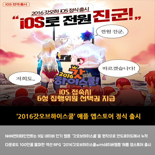 NHN엔터테인먼트는 9일 네이버 인기 웹툰 '갓오브하이스쿨'을 원작으로 안드로이드에서 누적 다운로드 100만을 돌파한 액션 RPG '2016갓오브하이스쿨with네이버웹툰'애플 앱스토어 출시
