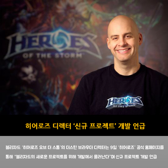 블리자드 '히어로즈 오브 더 스톰'의 더스틴 브라우더 디렉터는 9일 '히어로즈' 공식 홈페이지를 통해 "블리자드의 새로운 프로젝트를 위해 개발에서 물러난다"며 신규 프로젝트 개발 언급