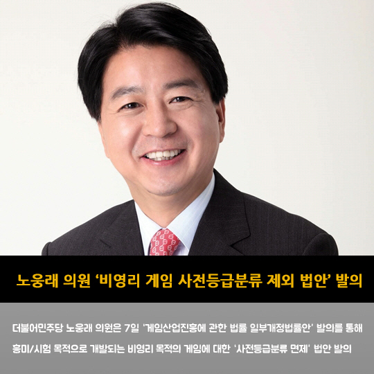 더불어민주당 노웅래 의원은 7일 '게임산업진흥에 관한 법률 일부개정법률안' 발의를 통해 흥미/시험 목적으로 개발되는 비영리 목적의 게임에 대한 '사전등급분류 면제' 법안 발의