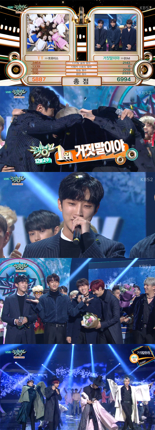 9일 KBS2 '뮤직뱅크'에서 B1A4의 신곡 '거짓말이야'는 총점 6994점으로 5887점의 트와이스 'TT"를 누르고 1위를 차지했다.