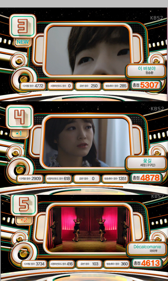 3위는 정승환의 '이바보야', 4위는 김세정의 '꽃길', 5위는 마마무의 '데칼코마니'가 차지했다.