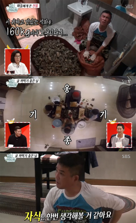 김흥국, 이수근, 소속사 대표가 다라 주변에 앉아 각자 도마를 대신한 빨래판과 나이프를 들고 석화를 물고 뜯고 맛보기 시작했다.