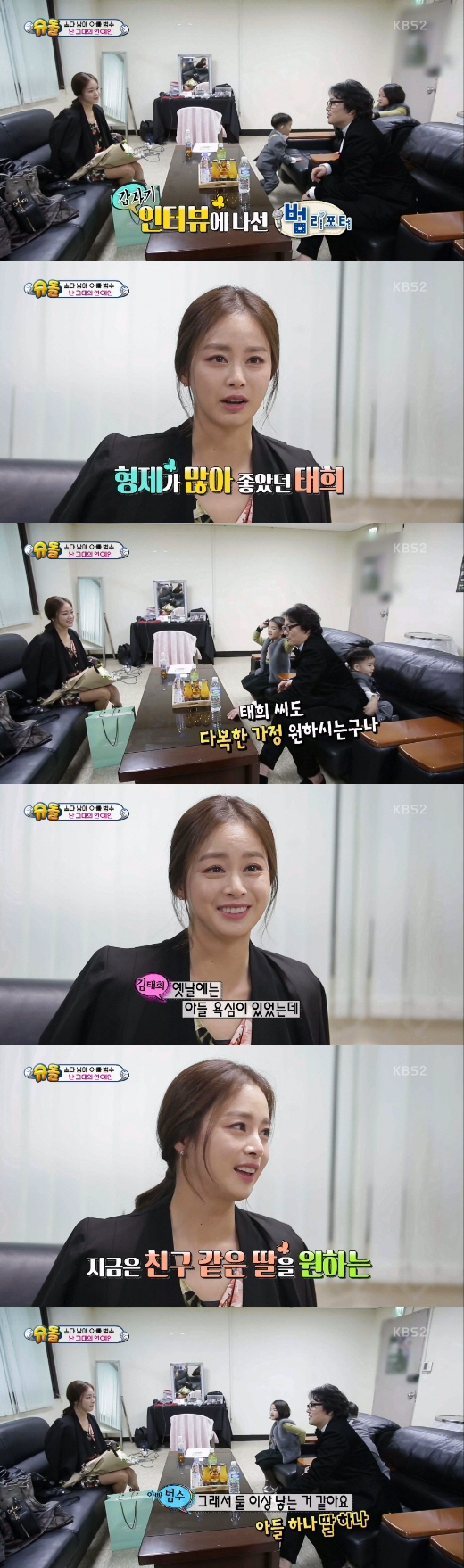 이범수는 "아들이 좋냐, 딸이 좋냐"고 다시 물었다. 이에 김태희는 "옛날에는 아들 욕심이 있었는데 지금은 친구 같은 딸이 제일 부러운 것 같다"는 생각을 전했다.