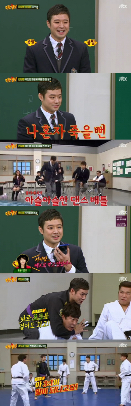 이후 천정명은 '아는 형님' 멤버 이상민, 김영철, 이수근과 3:1 대결을 펼쳤다. 세 사람은 동시에 천정명을 공격했고, 천정명은 긴장을 놓지 않으면서도 침착하게 대결에 임했다. 결국 천정명의 현란한 기술에 형님 3인방은 대패했다.