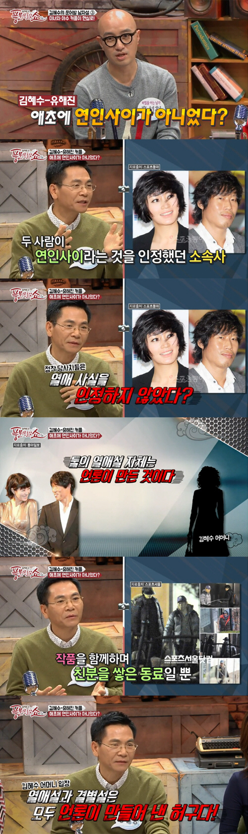 그러자 다른 기자는 "부인한 적도 없잖냐?"라고 물었고, 강일홍 기자는 "부인한 적도 없다"고 답하며 "김혜수가 청룡영화상 MC를 오랫동안 했잖냐. 생방송 중에 절대 답변을 안 할 수 없도록 같은 동료 배우가 객석에 앉아가지고 질문을 하니까 김혜수가 웃으면서 반쯤 인정하는 듯한. 피해갈 수가 없잖냐. 아니라고 해도 이상하고. 그래서 그런 적은 있지만 정말 어떤 자리에서든 완전 쿨 하게 인정하지 않았다"고 설명했다.