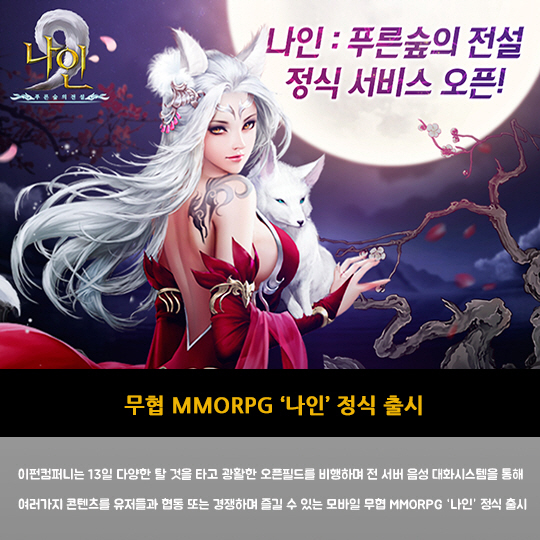 이펀컴퍼니는 13일 다양한 탈 것을 타고 광활한 오픈필드를 비행하며 전 서버 음성 대화시스템을 통해 여러가지 콘텐츠를 유저들과 협동 또는 경쟁하며 즐길 수 있는 모바일 무협 MMORPG '나인' 정식 출시