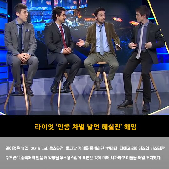 라이엇은 11일 '2016 LoL 올스타전' 둘째날 경기를 중계하던 '벤데타' 디에고 라미레즈와 바스티안 구즈만이 중국어의 발음과 억양을 우스꽝스럽게 표현한 것에 대해 사과하고 이들을 해임 조치했다.