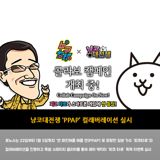 포노스는 22일부터 1월 5일까지 '팬 파인애플 애플 팬(PPAP)'로 유명한 일본 가수 '피코타로'와 컬래버레이션을 진행하고 특별 스테이지 클리어를 통해 레어 캐릭터 '피코 타로' 획득 이벤트 실시