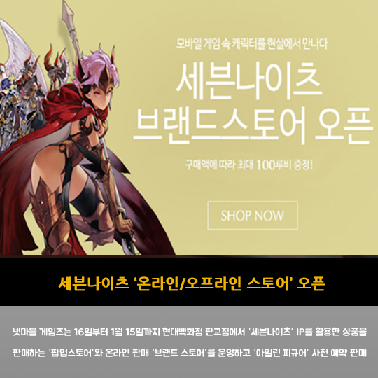 넷마블 게임즈는 16일부터 1월 15일까지 현대백화점 판교점에서 '세븐나이츠' IP를 활용한 상품을 판매하는 '팝업스토어'와 온라인 판매 '브랜드 스토어'를 운영하고 '아일린 피규어' 사전 예약 판매