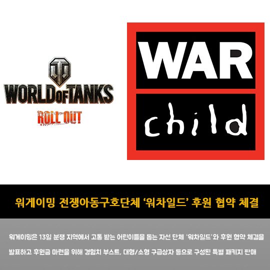 워게이밍은 13일 분쟁 지역에서 고통 받는 어린이들을 돕는 자선 단체 '워차일드'와 후원 협약 체결을 발표하고 후원금 마련을 위해 경험치 부스트, 대형/소형 구급상자 등으로 구성된 특별 패키지 판매